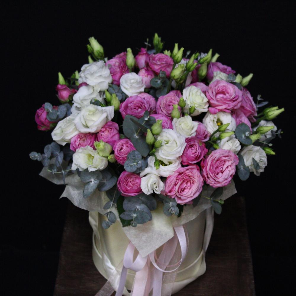 Пионовидная кустовая роза – 7 шт.эустома белая – 5 шт.Коробка шляпная – 1 шт.Оазис флористический – 1 шт.Эвкалипт Baby Blue – 5 шт.Лента атласная – 3 шт.