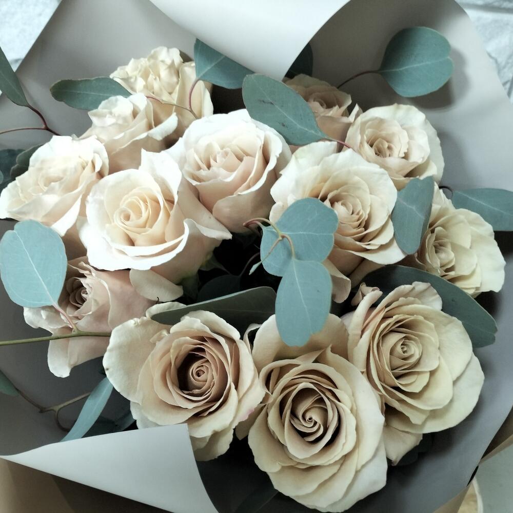 Лента атласная – 1 шт.Упаковка дизайнерская – 2 шт.Роза эквадор 40 см – 13 шт.Эвкалипт Микс – 2 шт.