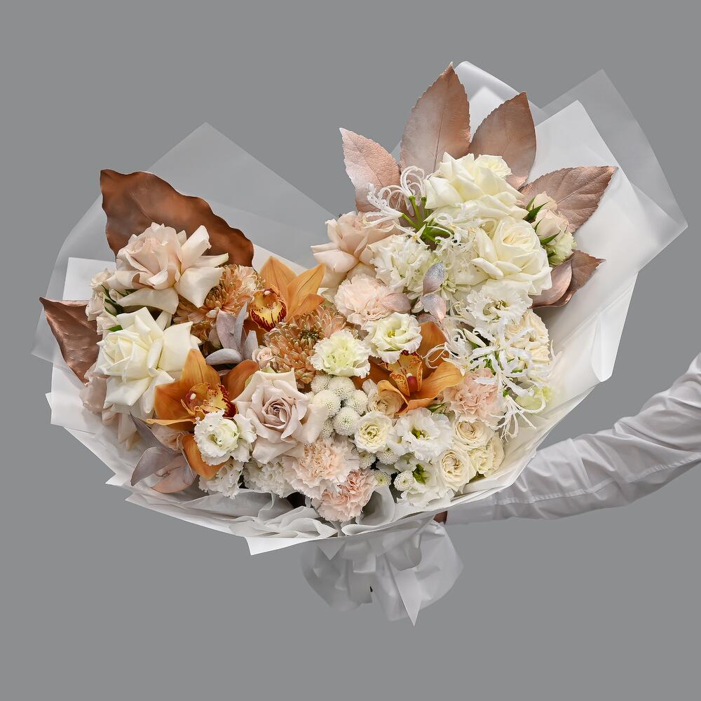 Гортензия – 1 шт.Французская роза – 7 шт.Эустома – 4 шт.Гвоздика – 7 шт.Роза кустовая – 3 шт.Рускус – 7 шт.Хризантема – 3 шт.ЦИМБИДИУМ – 3 шт.Сантини – 4 шт.Нерина – 2 шт.Аралия – 1 шт.Магнолия – 2 шт.Упаковка дизайнерская – 1 шт.