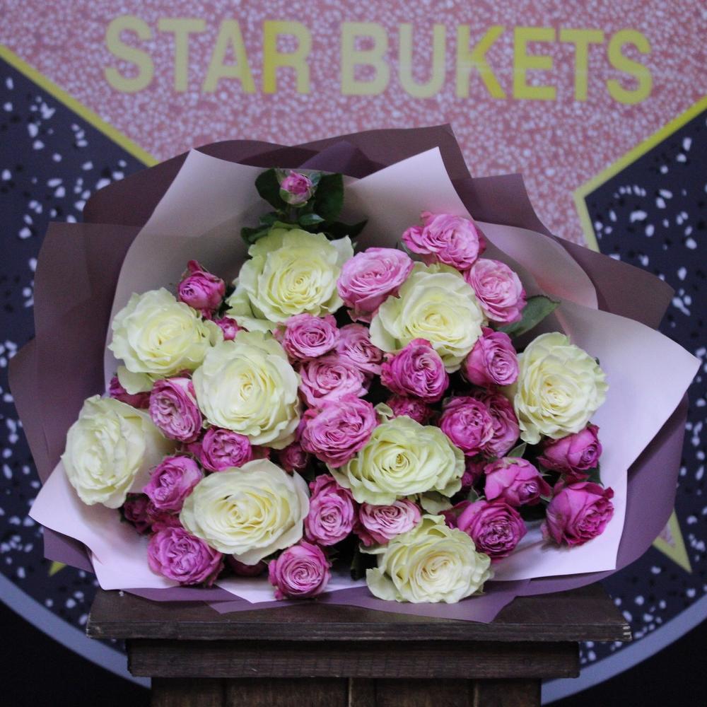 Роза Мондиаль – 9 шт.роза кустовая пионовидная леди бомбастик – 6 шт.Пленка дизайнерская – 5 шт.Лента атласная – 1 шт.