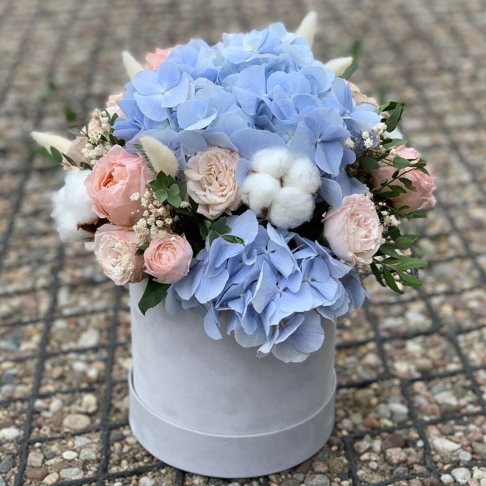 Нежная коробка, в составе которой гортензия, кустовые пионовидные розочки двух сортов, сухоцветы, в лице хлопка, лагуруса и гипсофилы.