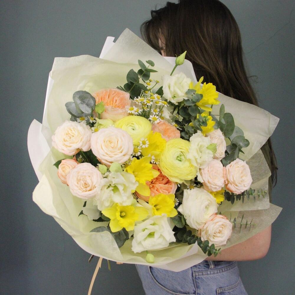 Нарцисс – 7 шт.Ранункулюс – 3 шт.Ромашка – 3 шт.Роза кустовая пионовидная – 3 шт.Роза пионовидная – 3 шт.Лизиантус – 5 шт.эваклипт – 3 шт.Упаковка – 1 шт.