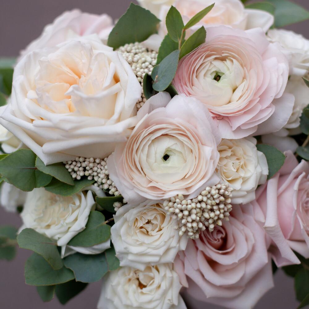 Ранункулюс – 3 шт.Роза пионовидная – 3 шт.Роза – 4 шт.Роза кустовая – 3 шт.Эвкалипт – 7 шт.Озотамнус – 1 шт.