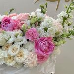 Роза кустовая белая – 2 шт.Роза кустовая пионовидная – 9 шт.Пион розовый – 5 шт.Маттиола – 5 шт.Роза белая пионовидная – 3 шт.ранцнкулюс – 2 шт.Гвоздика – 15 шт.Эустома – 7 шт.коробка большая брендированнвя – 1 шт.Лента атласная – 2 шт.Упаковка тишью – 3 шт.Оазис флористический – 1 шт.