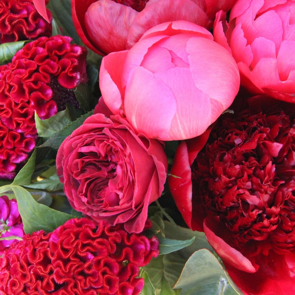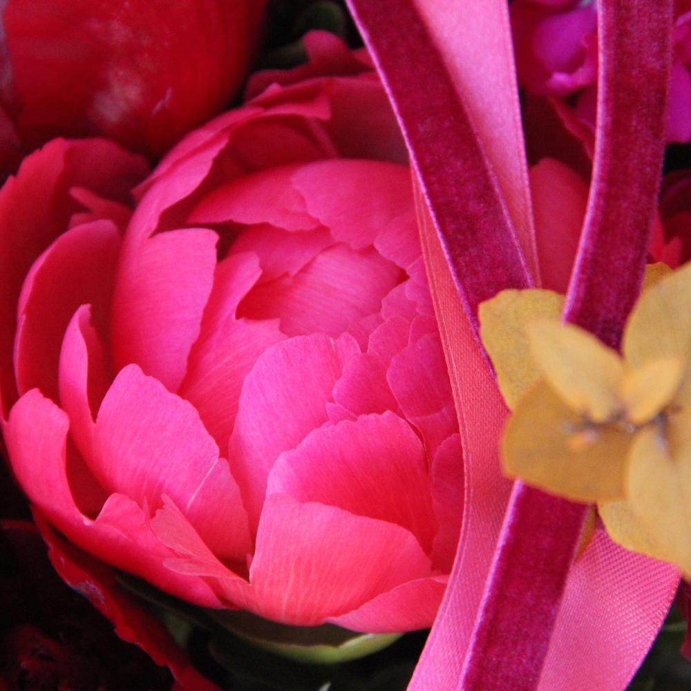 Пион – 7 шт.целозия красная – 5 шт.Роза пионовидная – 3 шт.Маттиола – 5 шт.Эвкалипт стабилизированный – 6 шт.Эвкалипт – 5 шт.Лента атласная – 3 шт.
