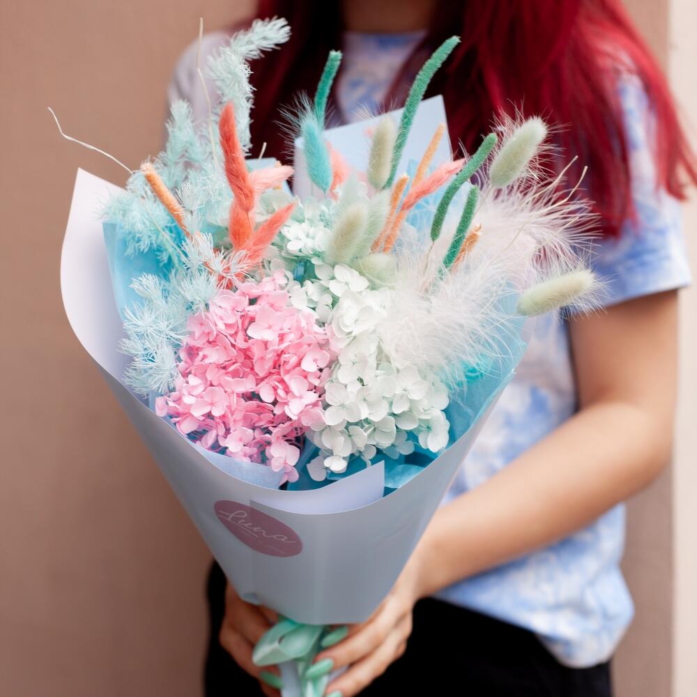 Лагурус (сухоцвет) – 8 шт.Дизайнерская упаковка – 1 шт.флеум – 9 шт.гортензия стабилизированная – 3 шт.аспарагус стабилизированный – 2 шт.ковыль сухоцвет – 2 шт.
