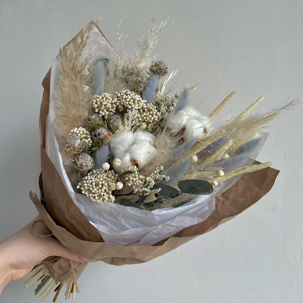 Лимониум – 1 шт.Озотамнус – 1 шт.Хлопок – 2 шт.Эвкалипт – 2 шт.Пшеница – 2 шт.Капс – 2 шт.Упаковка дизайнерская – 1 шт.Лен – 1 шт.Лагурус – 8 шт.Мак – 4 шт.Флум – 11 шт.пампасная трава – 1 шт.