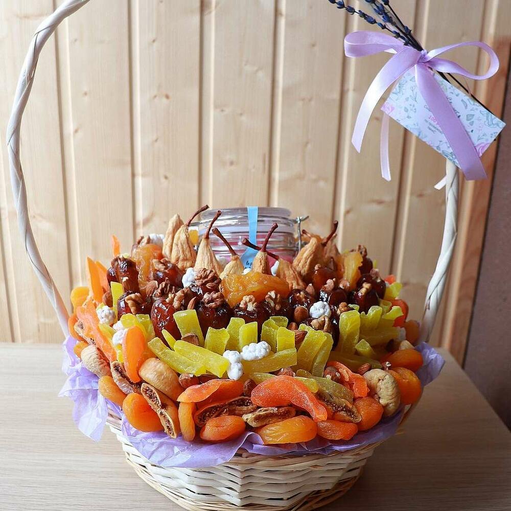 Грецкий орех – 200 гр.Папайя – 300 гр.Курага – 220 гр.Миндаль – 200 гр.груши сушенные – 130 гр.персик сушенный – 185 гр.манго лист – 100 гр.инжир сушенный – 170 гр.мед-суфле с малиной – 215 гр.финики без косточки – 400 гр.арахис в сахаре – 100 гр.Лаванда – 1 шт.