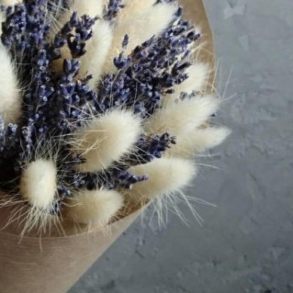 Лаванда (сухоцвет) – 55 шт.Лагурус (сухоцвет) – 15 шт.Крафт упаковка – 1 шт.бечевка натуральная – 1 шт.