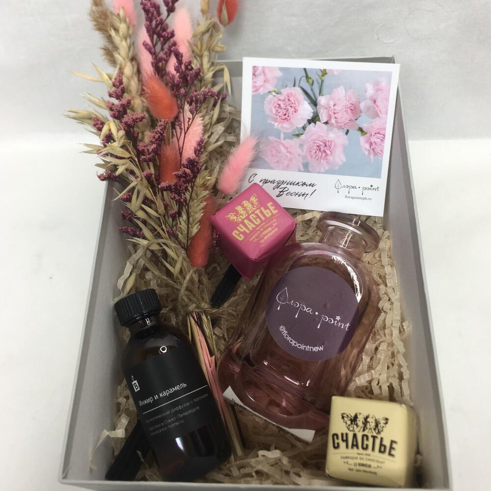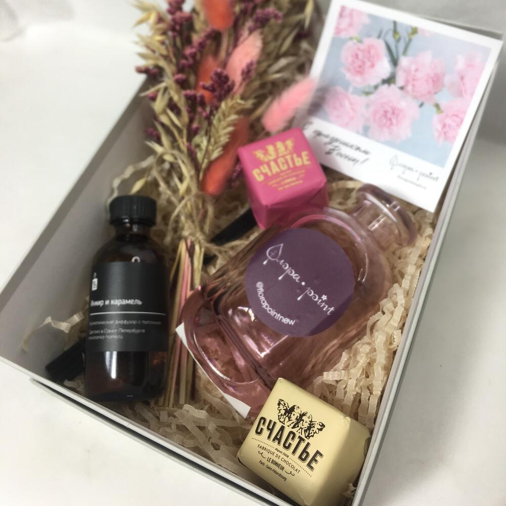 аромадиффузор для дома – 1 шт.конфета счастье – 2 шт.Ваза стекло – 1 шт.букет сухоцветов – 1 шт.Открытка – 1 шт.Подарочная коробка – 1 шт.Лента – 1 шт.