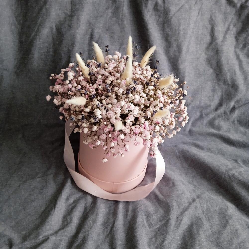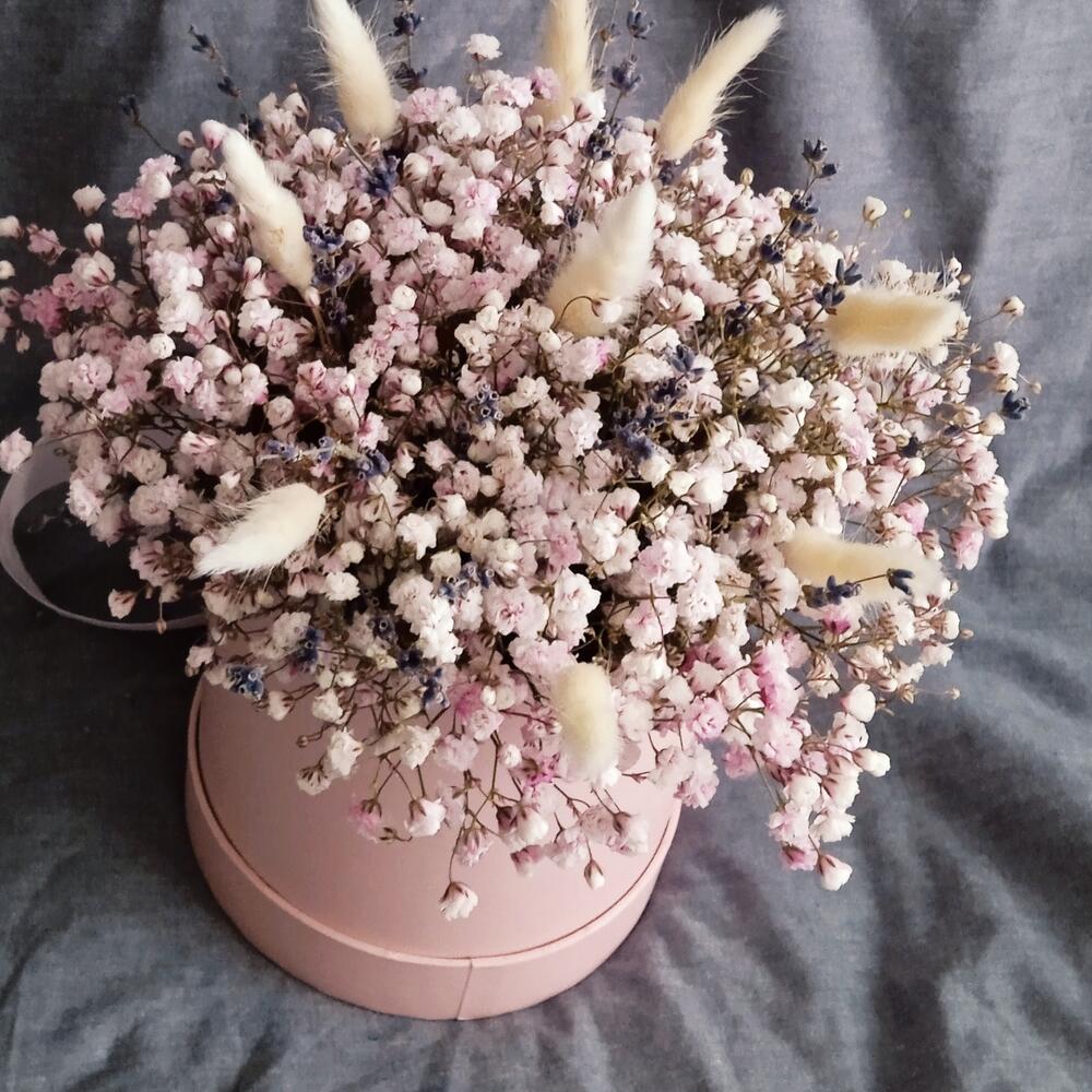 Розовая гипсофила с лавандой и лагурусом в шляпной коробке