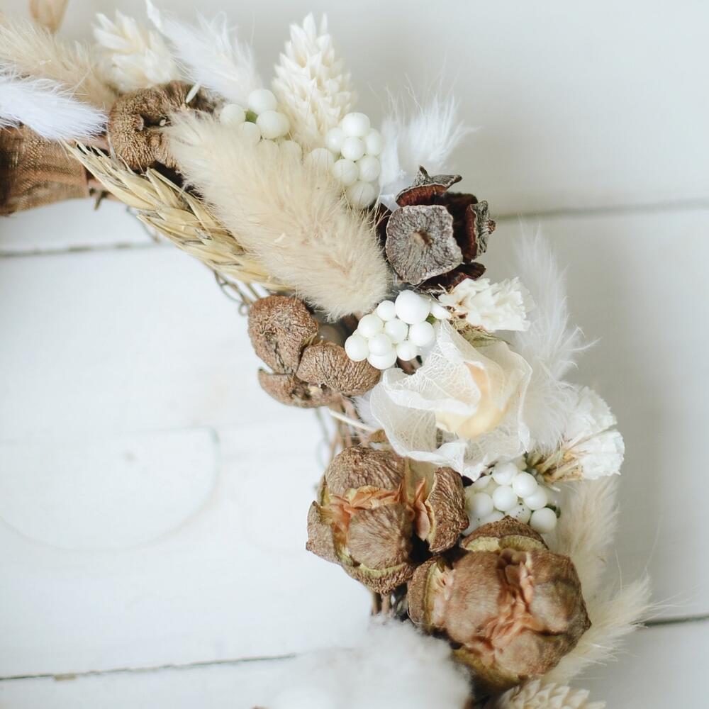 Основа для венка – 1 шт.Хлопок – 1 шт.сухоцветы микс – 1 шт.ветка искусственная белая – 1 шт.Тишью – 1 шт.Коробка – 1 шт.