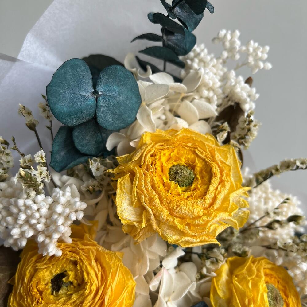 Лимониум – 2 шт.Озотамнус – 2 шт.Эвкалипт – 4 шт.Упаковка дизайнерская – 1 шт.листья протеи – 3 шт.ранункулюс сухоцвет – 3 шт.