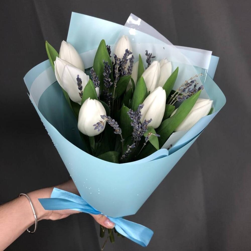 Тюльпан – 9 шт.Лаванда – 10 шт.Упаковка матовая – 1 шт.Лента атласная – 1 шт.