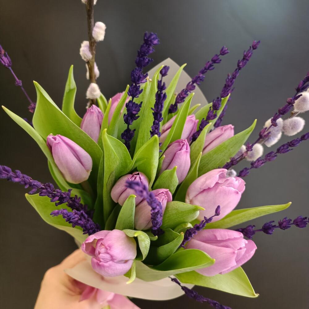 Тюльпан – 11 шт.лаванда стабилизированная пучок – 1 шт.Упаковка – 1 шт.Лента – 1 шт.транспортировочная упаковка – 1 шт.